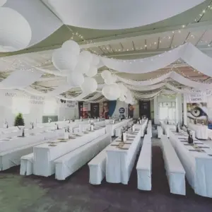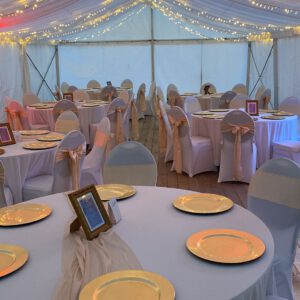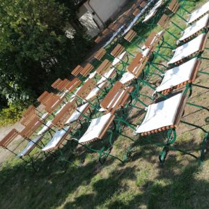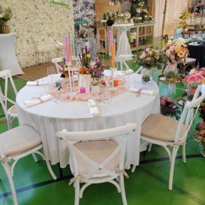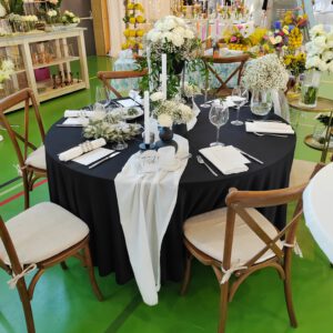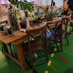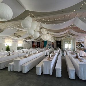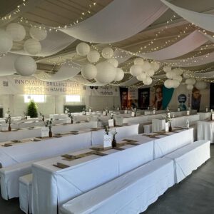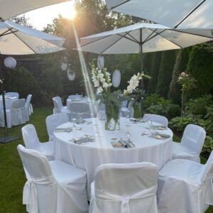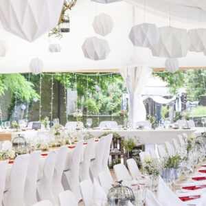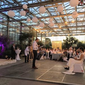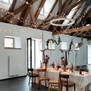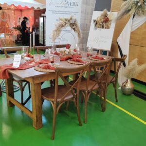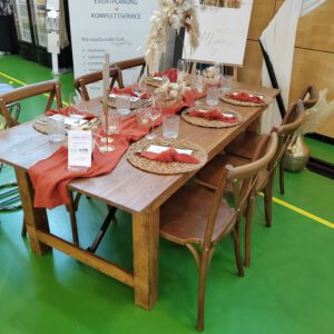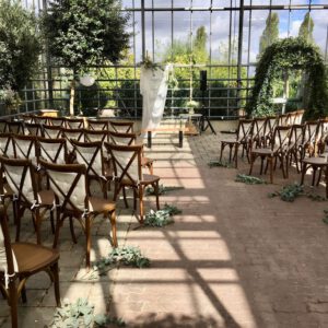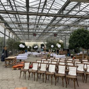 Das gigantische Gewächshaus der Fränkischen Toskana in Wiesentheid ist eine sehr schöne Location für Hochzeiten und Veranstaltungen. Gerne liefern wir hier Equipment und statten die Location mit Tischen, Stühlen, Tischwäsche etc. aus. Hier sind sehr viele Styles möglich, ob klassisch-schick mit Husse und Tischdecke oder im Boho-Style mit rustikalen Crossback-Stühlen und Holztischen oder eine Mischung z.B. aus weißen Crossback-Stühlen und runden Tischen mit Hussen. Sehr wandelbar und für jeden etwas dabei.